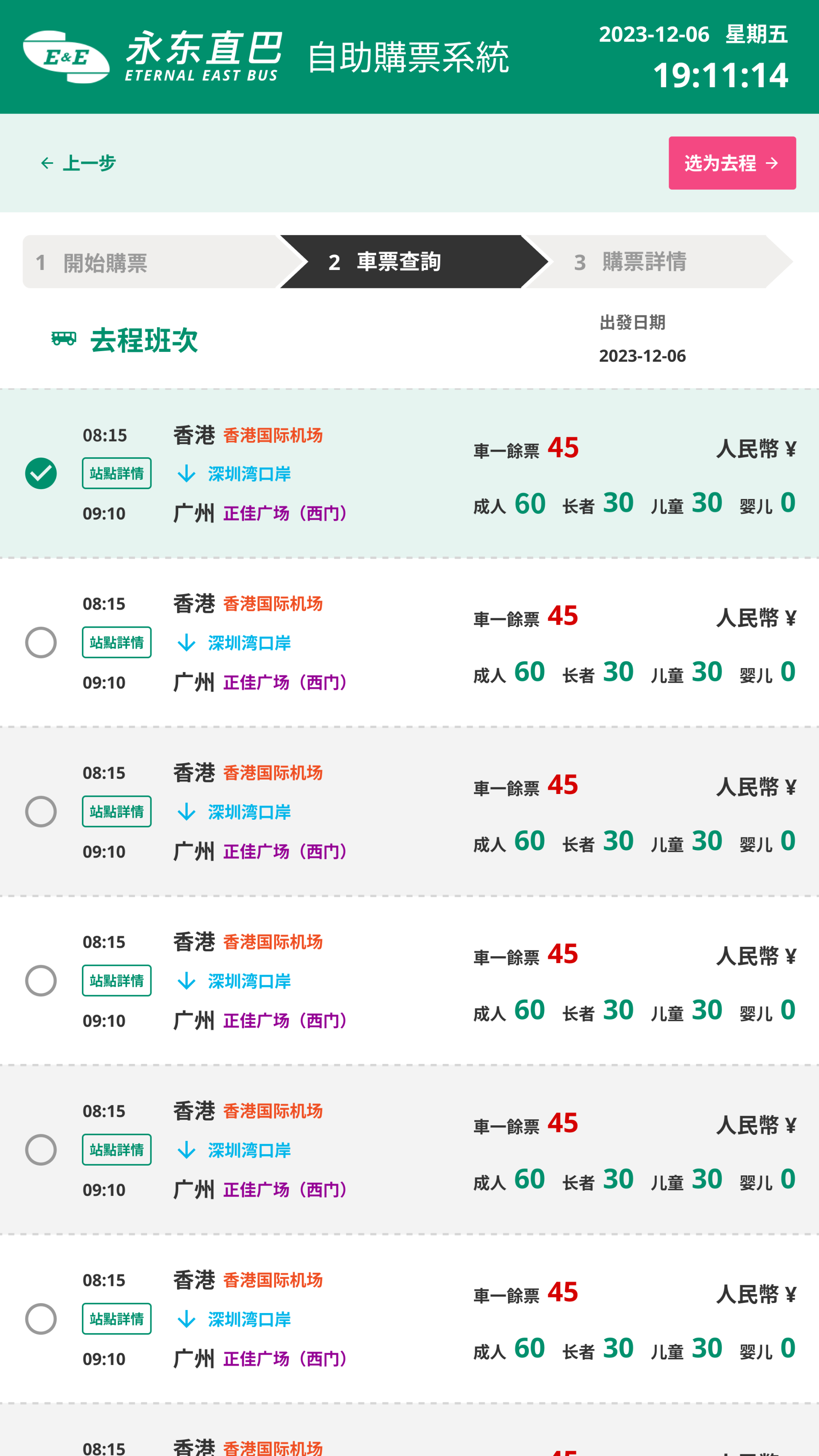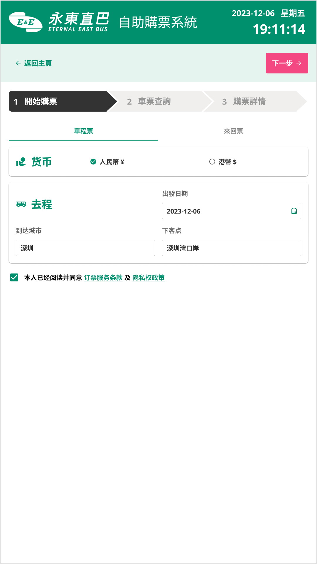 To purchase a one-way ticket with Eternal East Bus (永東巴士), you simply select the "One-way" (單程) option on their official website or app during the booking process. The fare for one-way tickets is typically based on distance.