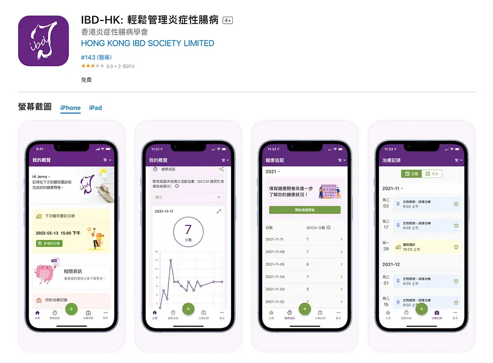 This is a mobile app developed by the Hong Kong IBD Society to help patients with inflammatory bowel disease (IBD) to better monitor their own health records and treatment.